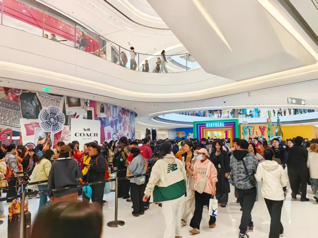 周六的中午,步入开业刚满三个多月的郑东万象城,位于商场一层中庭的定制打卡点成为了粉丝们在各大社交平台的热门素材。主动线上东西两侧一字排开的队伍像游戏中的“贪吃蛇”一般等待着进到场地的核心区抢购一切与“五月天”相关的周边及商品,而位于购物中心6-7层的餐饮门店外也跟着排起了长长的队伍。这一幕幕的场景背后,是演唱会经济与商业体的深度共振。