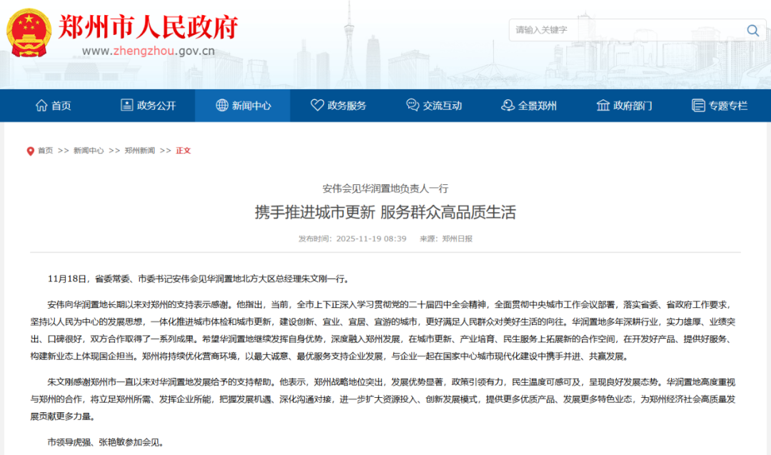 随后在2025年11月18日,省委常委、郑州市委书记安伟会见了华润置地北方大区总经理朱文刚一行,根据《郑州发布》的披露,双方谈到了“在城市更新、产业培育和民生服务上拓展新的合作空间,在开发好产品、提供好服务和构建新业态上体现国企担当”。值得注意的是,两任管城区委书记均陪同参加了会见。