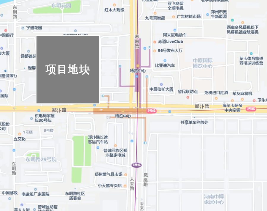 道路交通方面,项目东侧的未来路及南侧的郑汴路均为双向六车道,属于两条城市主干道