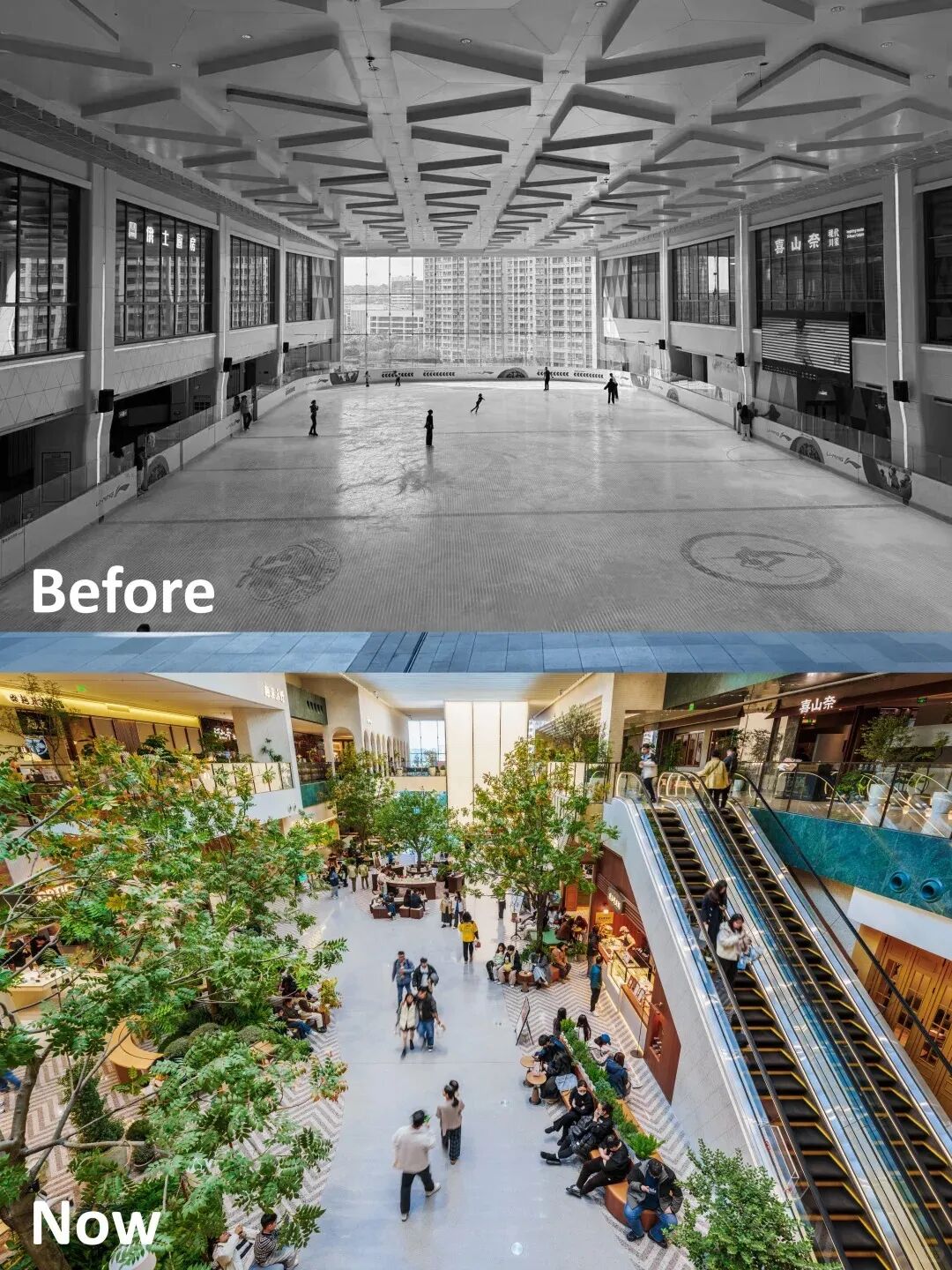 相似的改造案例在近几年也比比皆是,例如位于苏州的龙湖狮山天街和长沙的悦方ID Mall,均将冰场空间改造为新的空间和业态,达到了吸引客流光顾与中转,进而带动周边业态坪效与相邻楼层客流的目的。